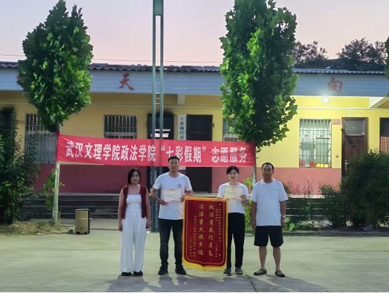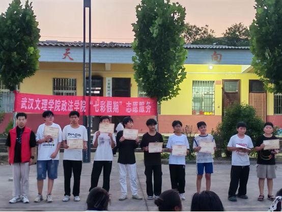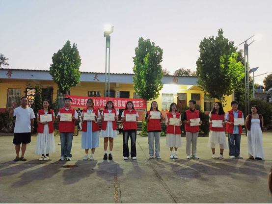 舞台中央的聚光灯,不仅照亮舞台,更聚焦成长!本次演出特别设置颁奖环节,既为暑期学堂里努力学习、进步明显的孩子提出表扬,见证“知识和成长双向奔赴”;也为辛勤付出的志愿者“小老师”和带队老师颁发荣誉,感谢他们的默默耕耘。太阳成集团“青衿之志”志愿服务队荣获十里铺村赠予锦旗,以表彰团队在暑期“三下乡”社会实践中的辛勤付出。志愿服务队扎根乡村,用实际行动践行青春担当,这份荣誉既是对志愿精神的肯定,更彰显了校地联动共筑温暖的美好情谊。