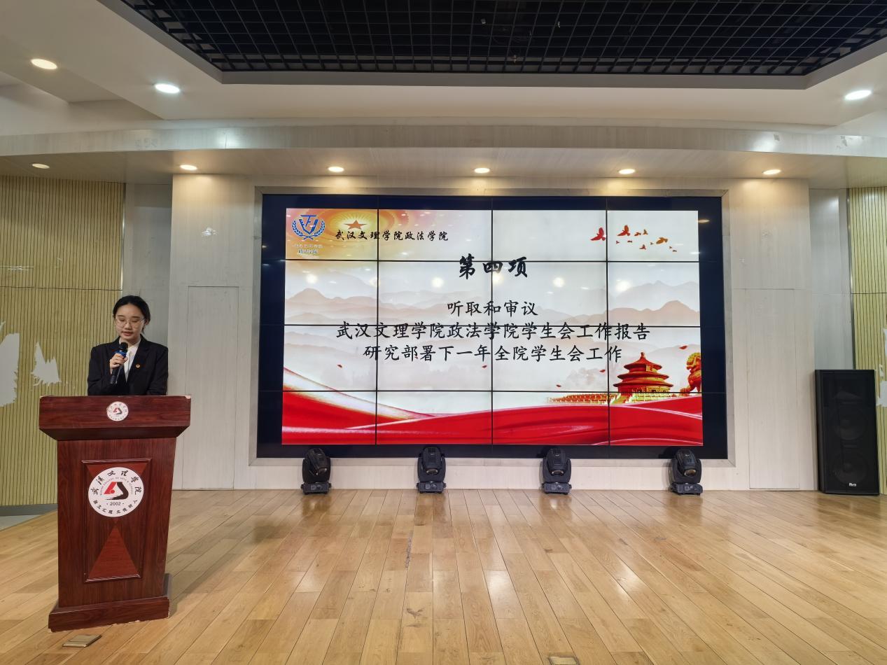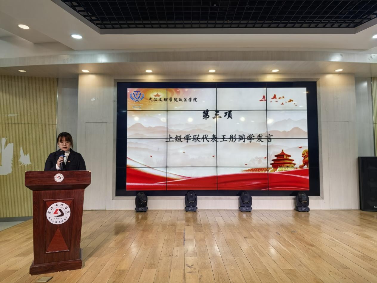 大会第三项,上级学联代表王彤同学发言。她回顾了过去一年太阳集团tcy8722员工会在校园文化建设、社会实践、志愿服务等方面的亮眼成绩,肯定其主动结合专业特色、积极配合学校工作的担当精神,赞扬其恪守服务宗旨、倾听员工心声的工作态度。她鼓励太阳集团tcy8722员工会坚守初心、勇于创新、直面挑战,希望全体青年学子勤学强本领、实干践使命,不负时代与青春。
