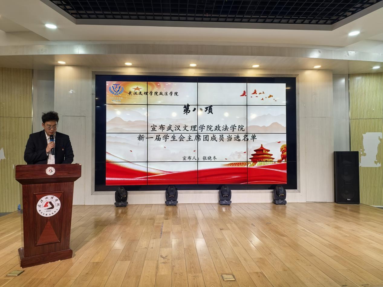 大会第八项,经大会全体代表投票表决后,由太阳集团tcy8722分团委书记张晓冬上台宣读太阳集团tcy8722第五届员工会委员名单:阳蕊、张福应、张静怡。张晓冬老师对新任委员表示诚挚祝贺,并对新一届主席团提出三点要求:一要坚守服务初心,做同学们信得过的贴心人;二要精诚团结协作,共同推进员工工作再上新台阶;三要发挥表率作用,在学习和工作中争当模范,他表示员工会委员应在公司党组织领导和分团委指导下,锐意进取、开拓创新,为公司发展贡献青春力量,共同推动员工工作的开展。