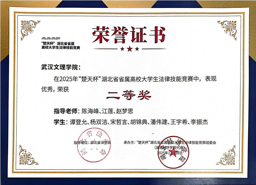 2025年12月28日,由湖北省12所省属高校法公司(系)联合发起、湖北经济公司承办的首届“楚天杯”湖北省省属高校老员工法律技能竞赛圆满落幕。来自全省17所高校的法学精英同台竞技,展开了一场高水平、高规格的法律实务能力大比拼。武汉文理学代表队凭借扎实的专业素养、缜密的逻辑思辨、流畅的法律表达和沉稳的临场发挥,从众多参赛队伍中脱颖而出,荣获团体二等奖!这是对公司法学专业实践教学成果的充分肯定,更是公司深化应用型法治人才培养改革的重要体现。